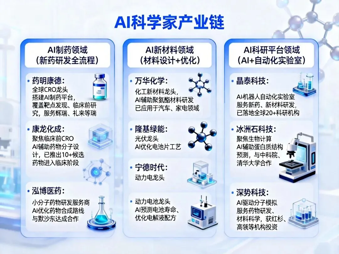AI从科研“辅助工具”升级为自主探索的“AI科学家”,与自动化实验室结合,加速新材料、新药、新能源的研发进程。