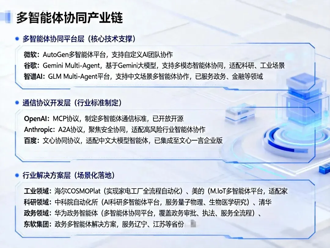 科研领域,多智能体分别负责文献检索、实验设计、数据处理,将量子物理研究效率提升40%;工业领域,生产智能体、物流智能体、质检智能体联动,实现工厂全流程自动化;政务领域,审批智能体、执法智能体、服务智能体协同,办事效率提升50%。