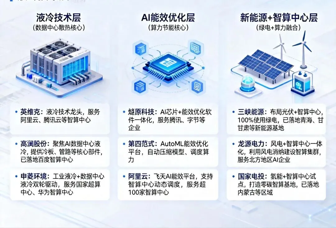 液冷技术服务商、AI能效优化工具、新能源+智算中心一体化方案。