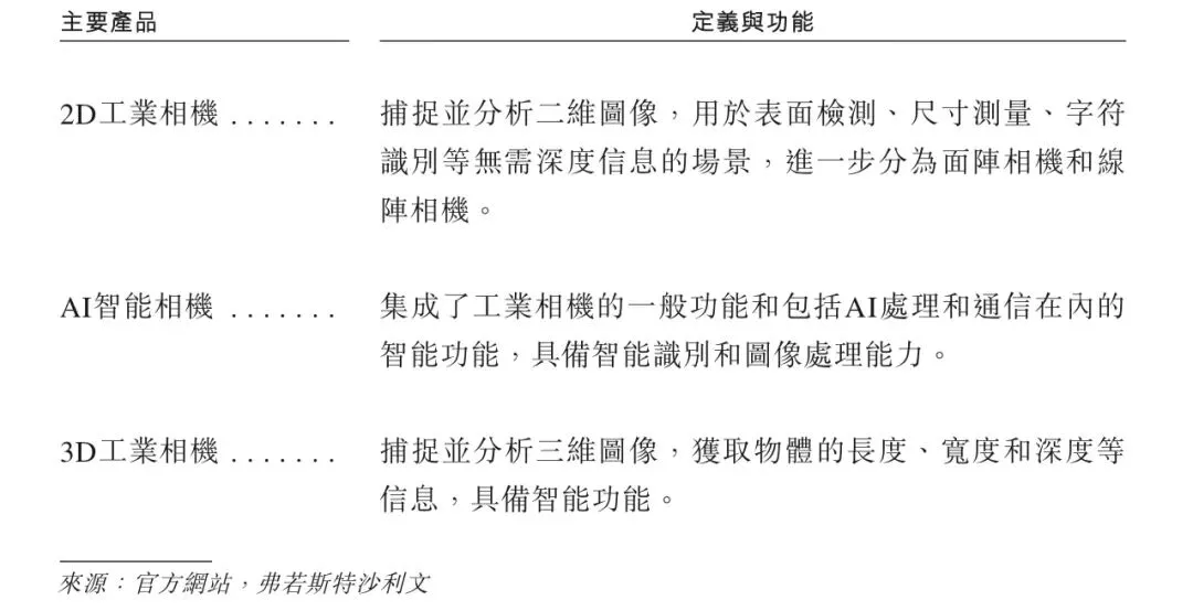 工业相机主要包括2D工业相机、3D工业相机以及AI智能相机。下表展示了每种产品的定义和功能。