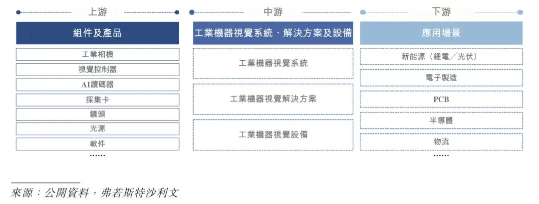 工业机器视觉价值链的上游主要包括核心组件及配件(包括工业相机、采集卡、视觉控制器、镜头、光源及软件)的供应商。工业机器视觉价值链的中游包括工业机器视觉系统、解决方案及设备的系统集成商、设备制造商及解决方案供应商。工业机器视觉价值链的下游包括新能源(锂电、光伏)、电子制造和半导体等下游应用场景。