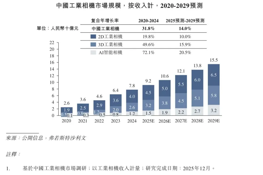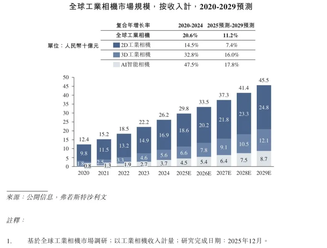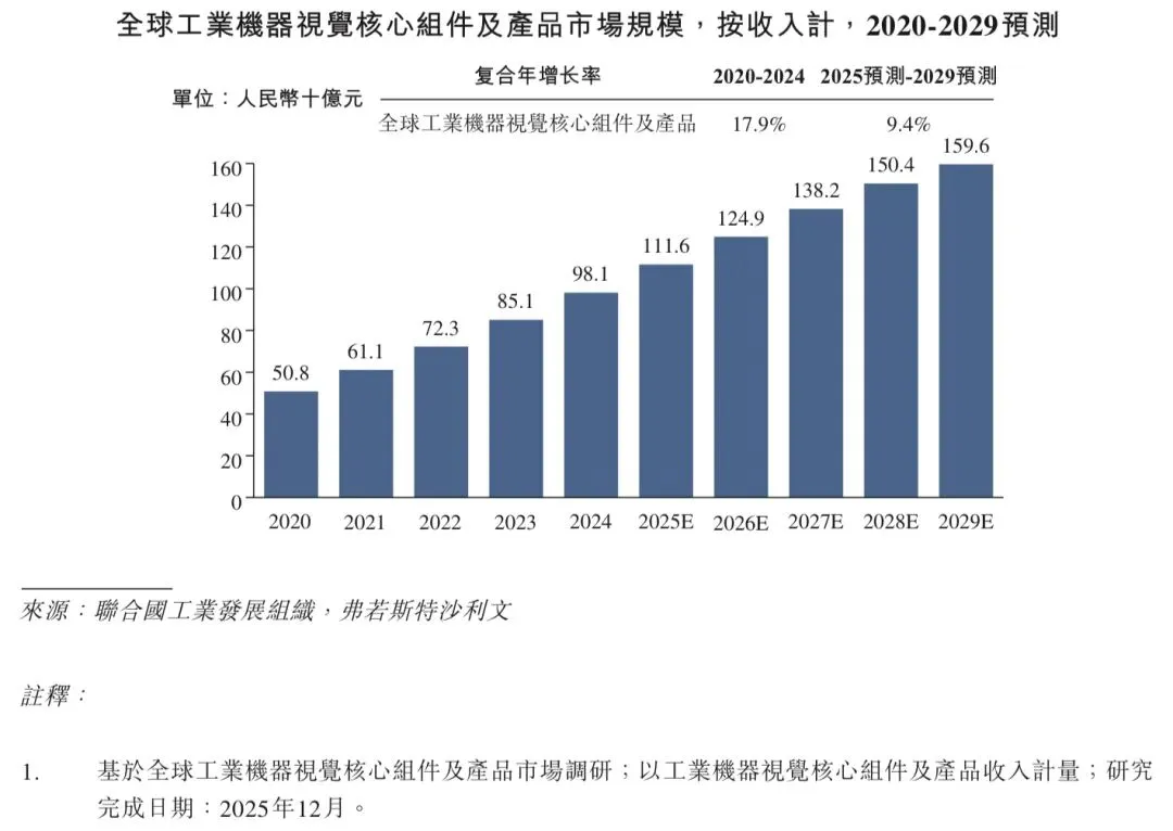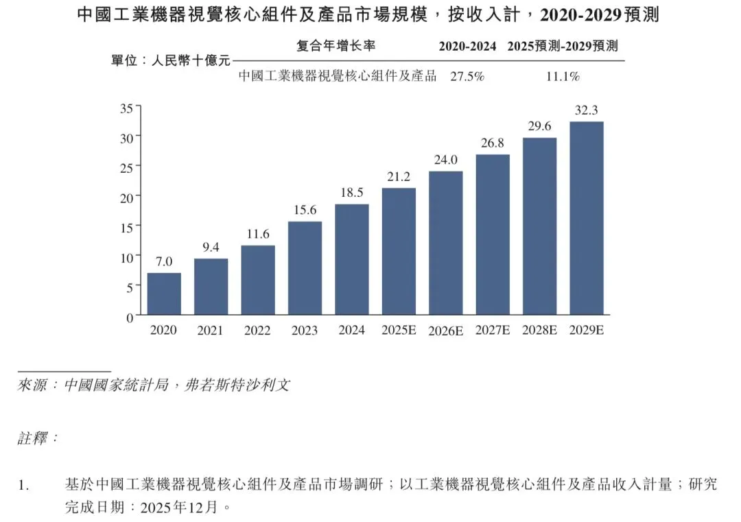 近年来,在工业数智化转型推进和智能工业设备应用日益广泛的推动下,工业机器视觉核心组件及产品的全球和中国市场规模均稳步增长,2020年至2024年的复合年增长率分别为17.9%和27.5%。2024年,按收入计,工业机器视觉核心组件及产品的全球和中国市场规模分别为人民币981亿元和人民币185亿元。展望未来,随着对基于成像的自动定位、识别、测量及检测的需求日益增长,且要求更加精确和智能化,预计工业机器视觉核心组件及产品的全球市场规模将保持稳定增长势头,预期于2029年收入将达到人民币1,596亿元;2025年至2029年的预计复合年增长率将达到9.4%。相比之下,在新能源、电子制造、PCB和半导体等下游行业对智能检验和分析需求日益增长的推动下,工业机器视觉核心组件及产品的中国市场规模预计于2029年收入将达到人民币323亿元,2025年至2029年的预计复合年增长率达到11.1%。