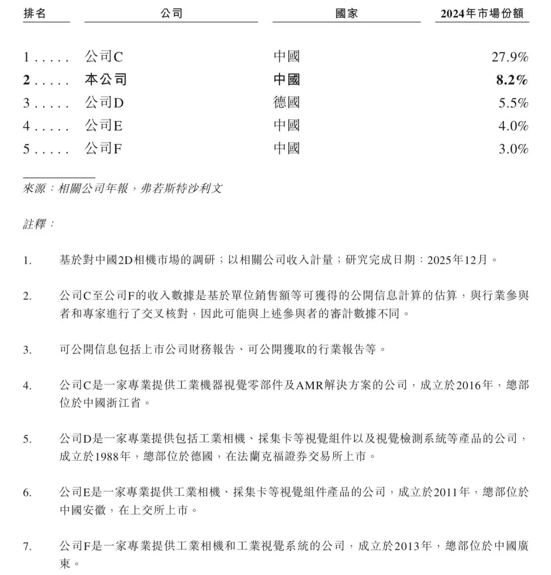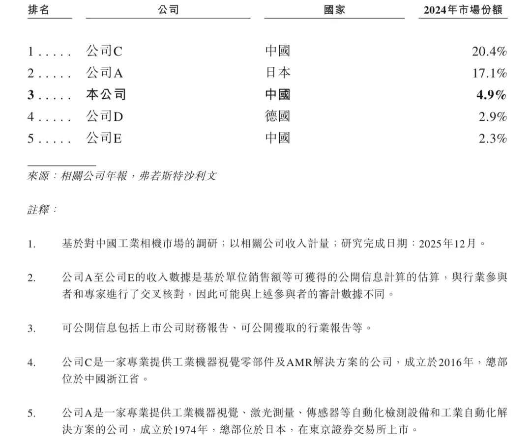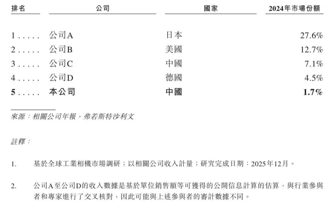 在全球工业相机市场中,海外公司占据主导地位,而华睿科技按收入排名位列第五,在国内公司中排名第二,2024年市场份额为1.7%。下表展示了2024年全球工业相机市场参与者按收入的排名情况。
