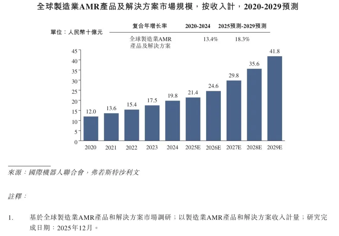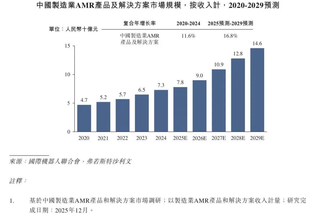 近年来,受劳动力成本上升与数智化加速所驱动,全球和中国制造业AMR产品及解决方案市场持续扩大,市场规模分别由2020年的人民币120亿元及人民币47亿元增至2024年的人民币198亿元及人民币73亿元,2020年至2024年的复合年增长率分别为13.4%及11.6%。展望未来,受制造业对智能制造和柔性生产线改造的需求上升所驱动,市场有望维持稳健增长态势。预计于2029年,全球和中国的市场规模将分别达到人民币418亿元及人民币146亿元,2025年至2029年的复合年增长率分别为18.3%及16.8%。