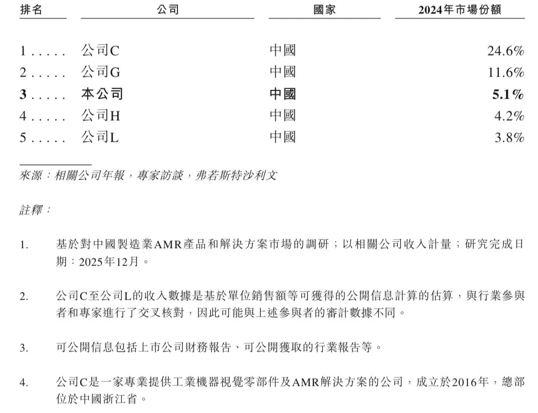 在中国制造业AMR产品和解决方案市场中,2024年华睿科技按收入排名第三,市场份额为5.1%,下表为2024年以营收衡量的中国制造业AMR产品及解决方案市场排名。