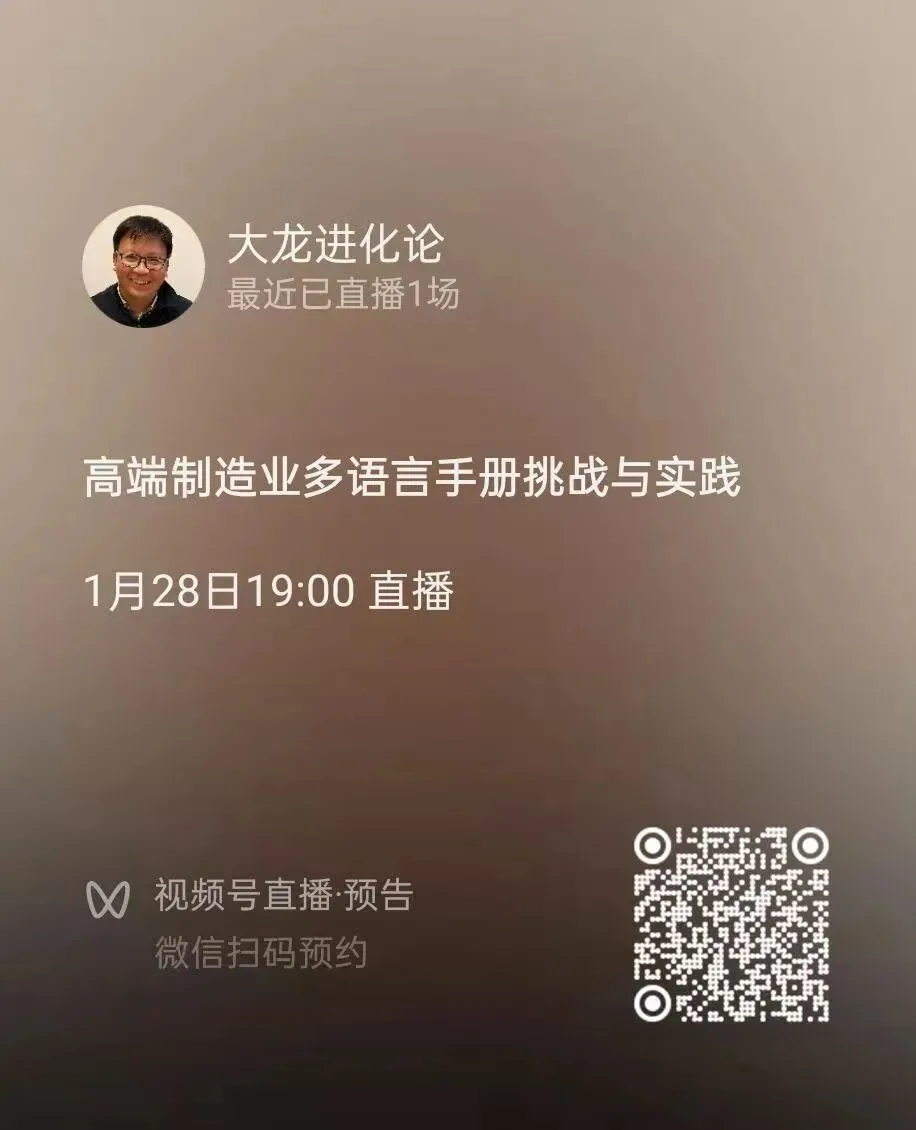 另外:本周三(1月28日)晚上7:00-8:00,我和一者科技的Shelly一起直播,聊高端制造业多语言手册的开发与挑战,欢迎扫码预约: