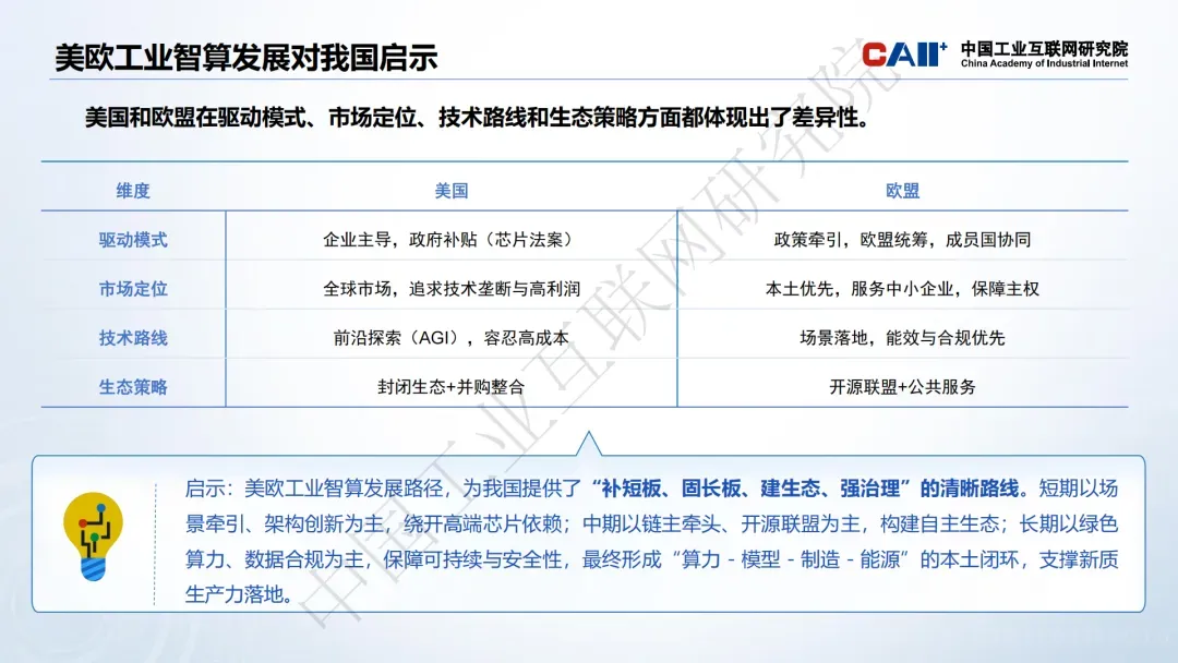 欧盟:分布式协同、主权优先,强调“能效优先+合规适配”,注重开源联盟与公共服务。