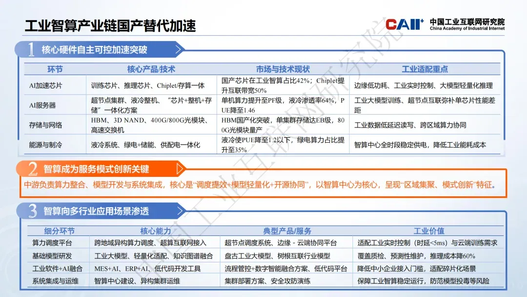 我国工业智算正处于政策驱动与市场爆发的关键期,2025 年智算规模预计达 1037.3EFLOPS,工业智算占比超 35%,2028 年占比将突破 50%。在产业链层面,国产替代加速推进,核心硬件国产化率达 42%,华为昇腾、寒武纪等企业实现技术突破,液冷、光模块等配套技术全球领先;中游服务模式持续创新,“算力超市”“按使用付费” 等形式降低了中小企业接入门槛;下游应用已渗透汽车制造、能源电力等多领域,实现质检准确率超 98%、研发周期缩短 30% 等量化成效。