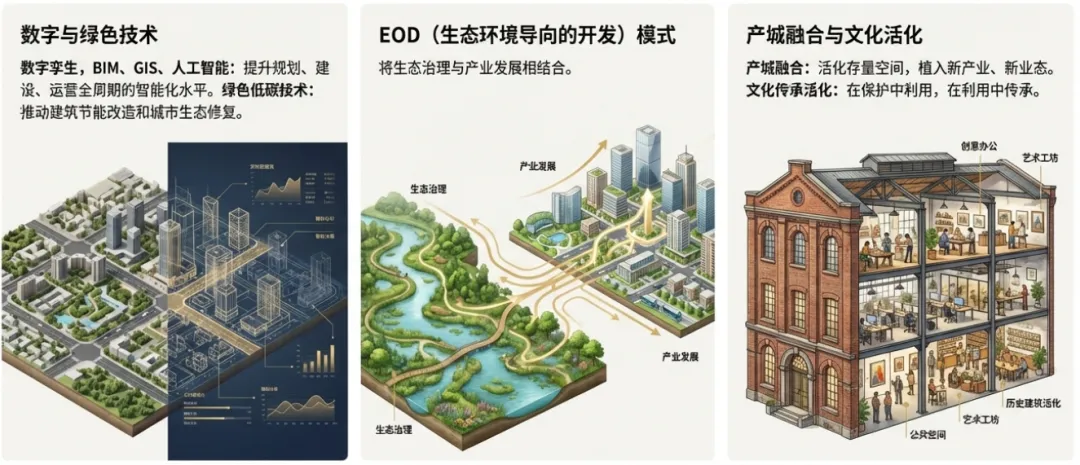 数字孪生、BIM、GIS、人工智能等数字技术与绿色低碳技术在城市更新项目中得到深化应用,推动城市治理向精细化、智能化转型。同时,EOD(生态环境导向的开发)、产城融合、文化传承活化等多元化更新模式不断涌现,告别了“大拆大建”的传统路径,转向内涵式、集约型、绿色化的有机更新。