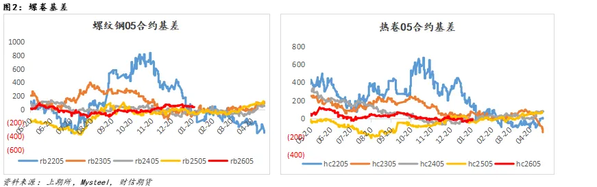 从基差角度来看,螺卷主力05合约基差表现有所分化。建材现实需求进一步走弱,而市场情绪回暖,驱动螺纹基差有所走弱,热卷需求尚显韧性,库存维持去化,基差持稳。从基差季节性角度来看,螺纹05合约基差处于中性水平,而热卷05合约升水现货,基差整体处于中性略低水平。