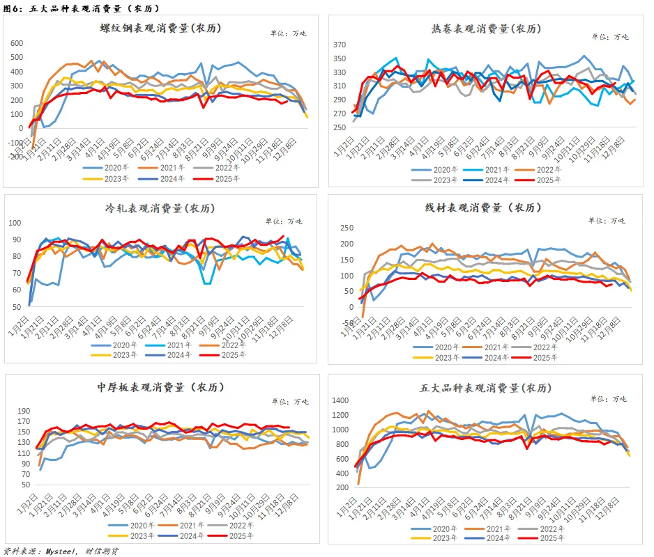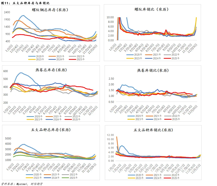 从库存角度来看,以Mysteel五大品种为对象,钢材总库存再度由降转增。考虑到当前需求整体偏弱,库销比整体处于近六年同期略偏高的水平。分品种来看,库存结构呈现分化:螺纹钢的库存绝对值处于近六年同期的偏低水平,库销比处于相对中性位置;而热卷的总库存绝对值仍处于近六年同期的最高水平,库销比亦处于相对高位。总体而言,从库存角度分析,春节假期临近,钢材需求仍有进一步下降空间,钢材库存累积速度重点在于钢厂复产的力度。