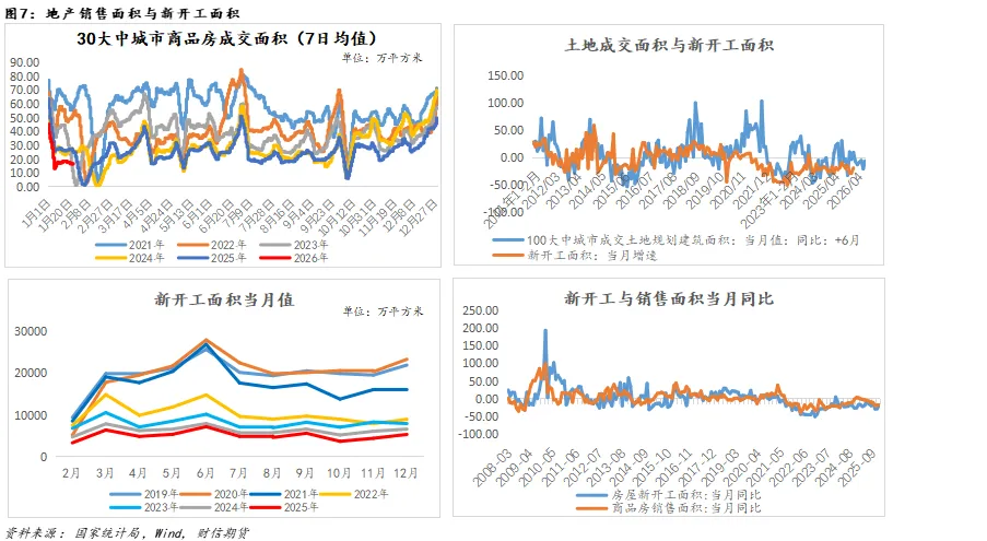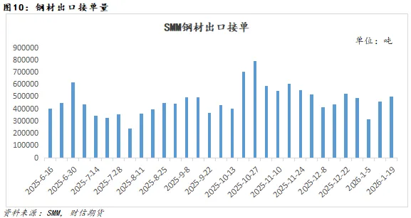 从钢材直接出口角度来看,钢材出港量环比下降较大,钢厂出口接单量下降背景下,短期钢材出口量或稳中有降。据SMM,26年第4周,32港钢材出港量为207.63万吨,环比下降47.85万吨。从内外价差来看,截止1月23日,热卷内外价差由-4.6回升至8.5,内外价差有所修复,钢材出口动能或略有增强。从样本钢厂接单量角度来看,1月以来样本钢厂周度接单量在42.44万吨,环比25年12月的46.51万吨有所下降,或预示未来钢材出港量整体相较25年12月有所下滑。关注钢材出口量是否有超预期表现。