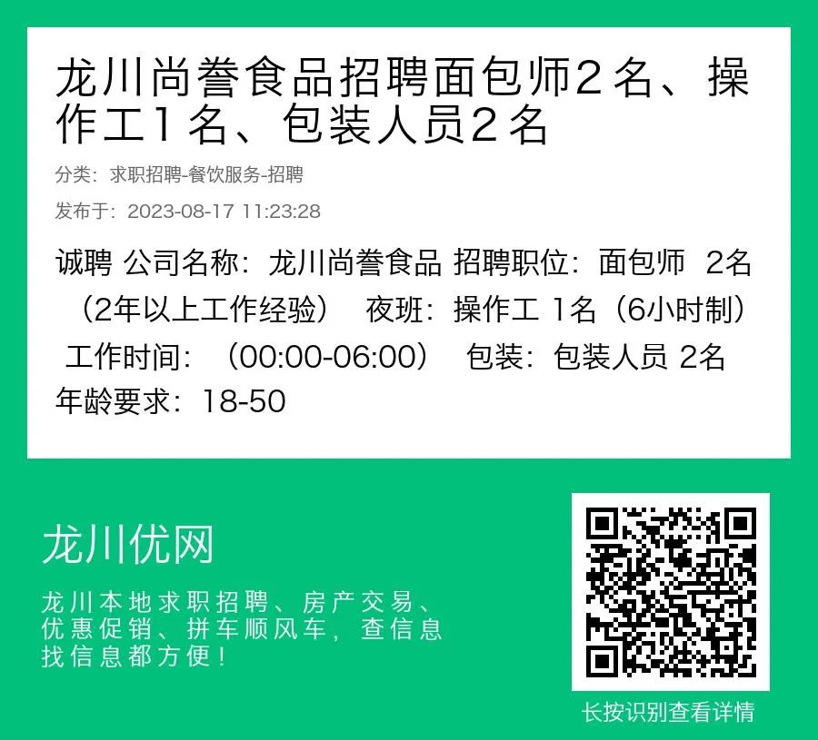 【招聘】龙川尚誊食品招聘面包师2名、操作工1名、包装人员2名