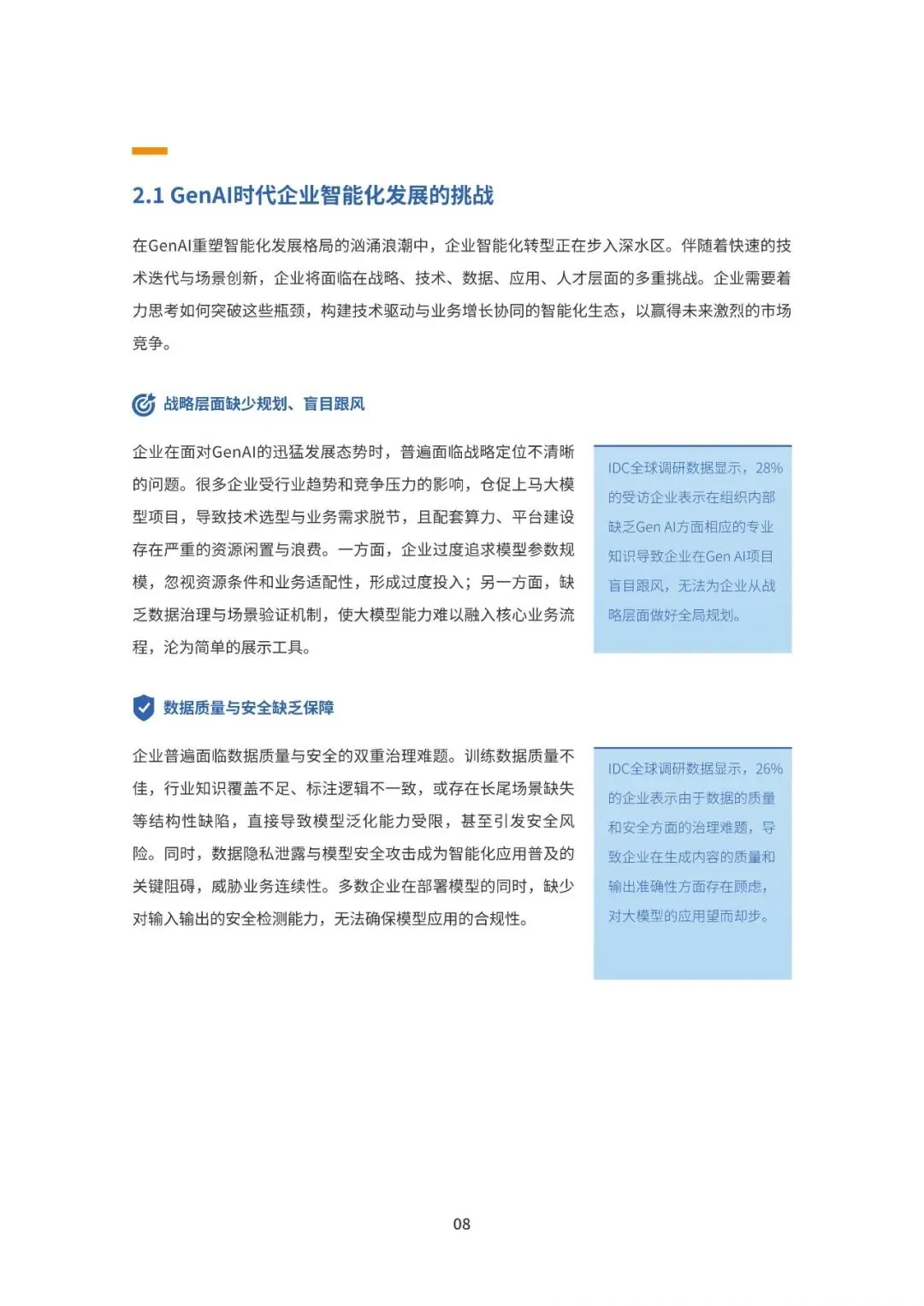 《立足GenAI时代,构建企业智能化发展新格局——企业AI开发与技术实践白皮书》由国际数据公司(IDC)编制,系统阐述了在生成式人工智能(GenAI)浪潮下,企业如何把握智能化转型机遇,构建可持续的AI开发与应用能力体系。