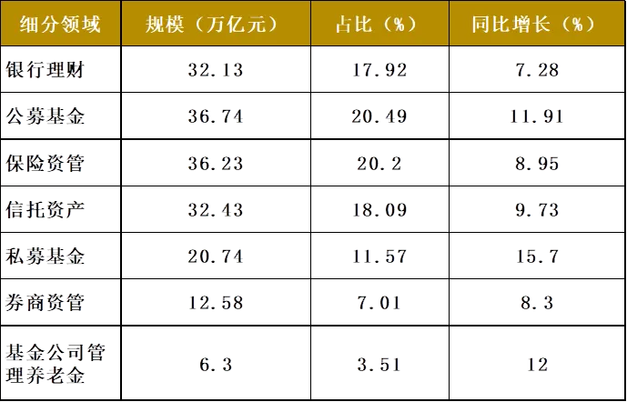 从规模占比来看,公募基金以 36.74 万亿元的规模位居第一,占比 20.49%;保险资管紧随其后,规模 36.23 万亿元,占比 20.20%;银行理财规模 32.13 万亿元,占比 17.92%;信托资产 32.43 万亿元,占比 18.09%。这四大机构类型合计占行业总规模的 76.7%,构成了中国资产管理行业的主体。