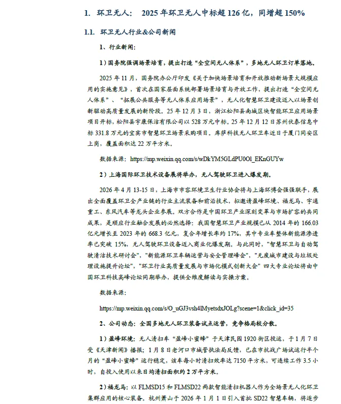 环卫无人行业新闻:1)2025 年11 月,国务院办公厅印发《关于加快场景培育和开放推动新场景大规模应用的实施意见》,首次提出打造“全空间无人体系”、“拓展公共服务等无人体系应用场景”。2)预计2026 年4 月13-15 日,上海市市容环境卫生行业协会将与上海环博会联手,展出覆盖环卫全产业链的主流装备和前沿技术,环卫无人设备或将迈入商业化爆发期。