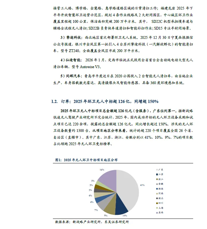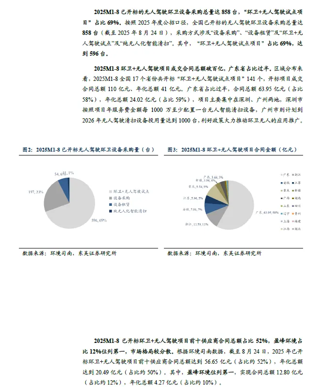2025 年环卫无人中标项目总金额超126 亿元(含服务),同增150%,广东位列第一。2025 年,国内成功开标的无人环卫设备采购和试点项目已达220 余项,披露的总金额超126 亿元,同比增长超过150%。涉及的无人环卫设备数量约1300 台。广东项目中标数量占比达41%。2025M1-8 已开标的无人驾驶环卫设备采购总量达858 台,“环卫+无人驾驶试点项目”占比69%。按照2025 年度公招口径,全国已开标的无人驾驶环卫设备采购总量达858 台(截至8 月24 日),采购方式涉及“设备采购”、“设备租赁”及“环卫+无人驾驶试点”及“纯无人化智能清扫”。其中,“环卫+无人驾驶试点项目”占比69%,达到596 台。