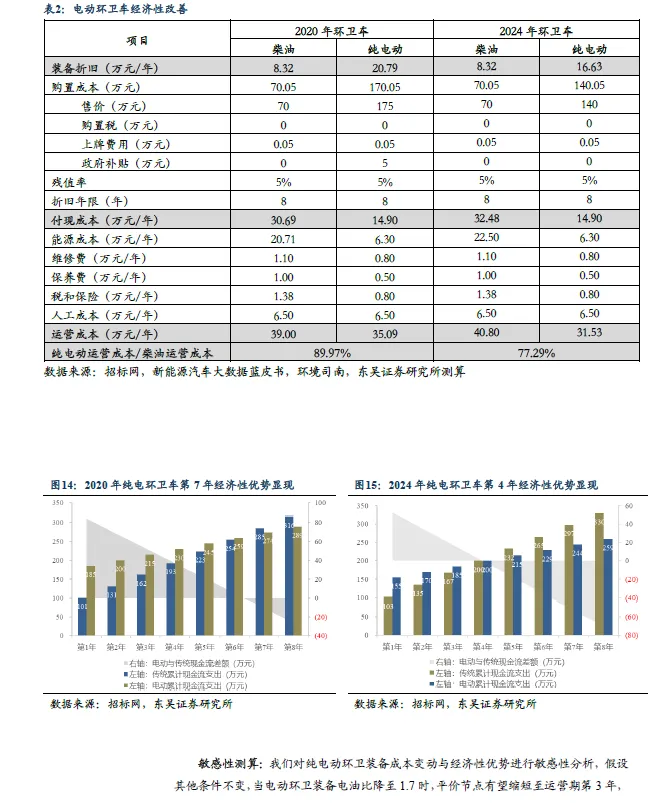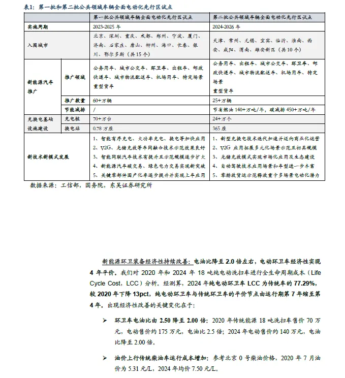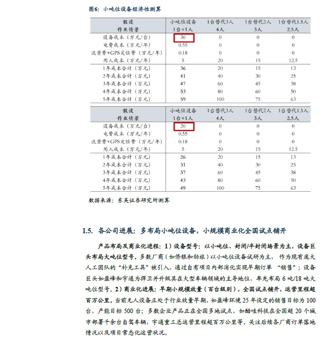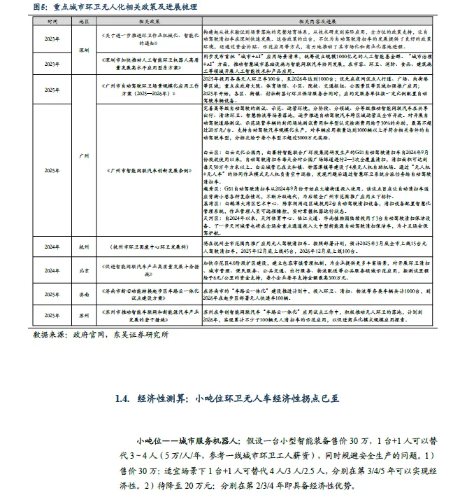 环卫无人经济性分析:小吨位环卫无人设备更具经济性,有望率先放量。小吨位设备:1 台+1 人可以替代3~4 人(5 万/人/年),同时规避安全生产的问题。①假设售价30 万:适宜场景下1 台+1 人可替代4 人/3 人/2.5人,分别在第3/4/5 年可以实现经济性。②待降至20 万元:分别在第2/3/4年即具备经济性优势。环卫无人产品布局及商业化进程:1)设备型号:以1-3 吨级别的小吨位为主,设备巨头布局大吨位型号。多数厂商以小吨位设备为主,通过自有项目实现“内销”;部分设备巨头率先布局大吨位型号。2)商业化进展:当前无人设备正处于行业放量早期,多数企业产品正在全国多地试点,关注后续各厂商订单落地情况以及项目常态化运营状况。