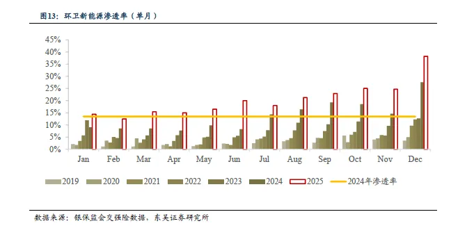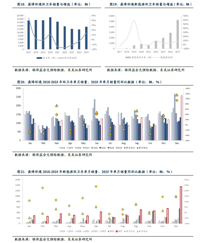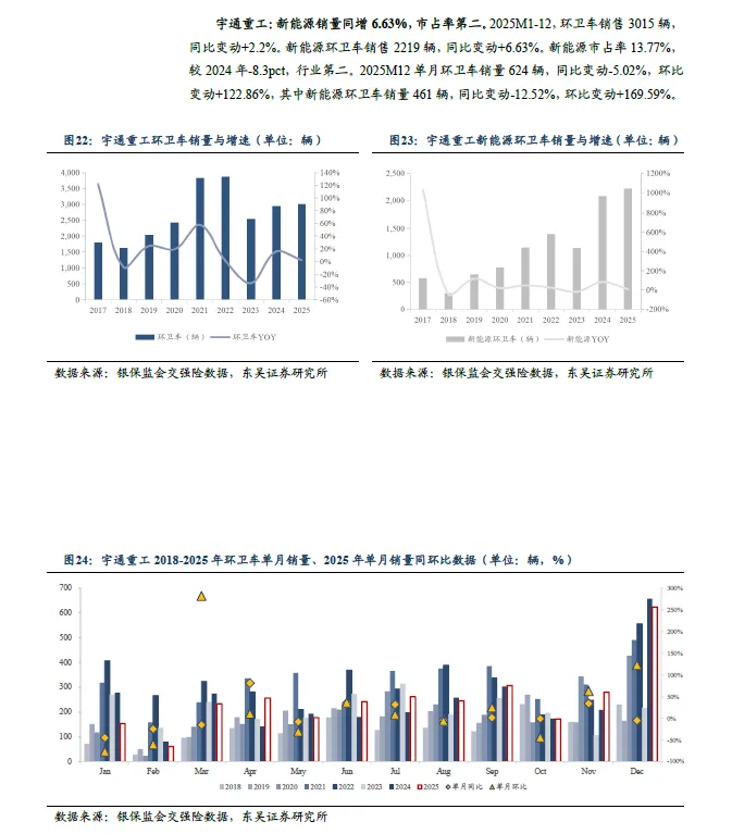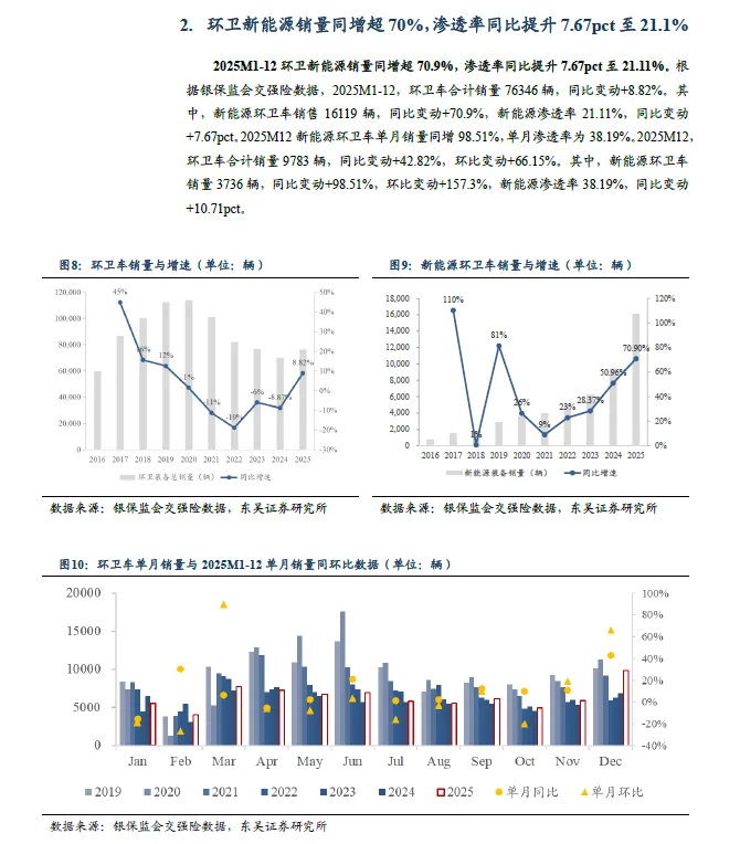 2025M1-12 环卫新能源销量同增70.9%,渗透率同比提升7.67pct 至21.11%。根据银保监会交强险数据,2025M1-12,环卫车合计销量76346 辆,同比变动+8.82%。其中,新能源环卫车销售16119 辆,同比变动+70.9%,新能源渗透率21.11%,同比变动+7.67pct。