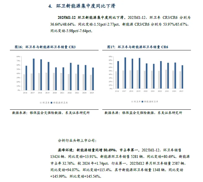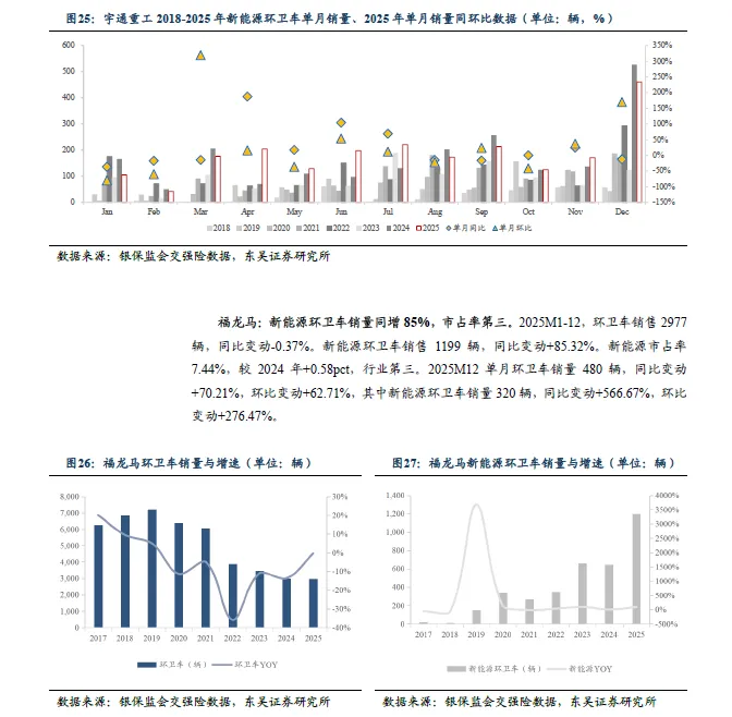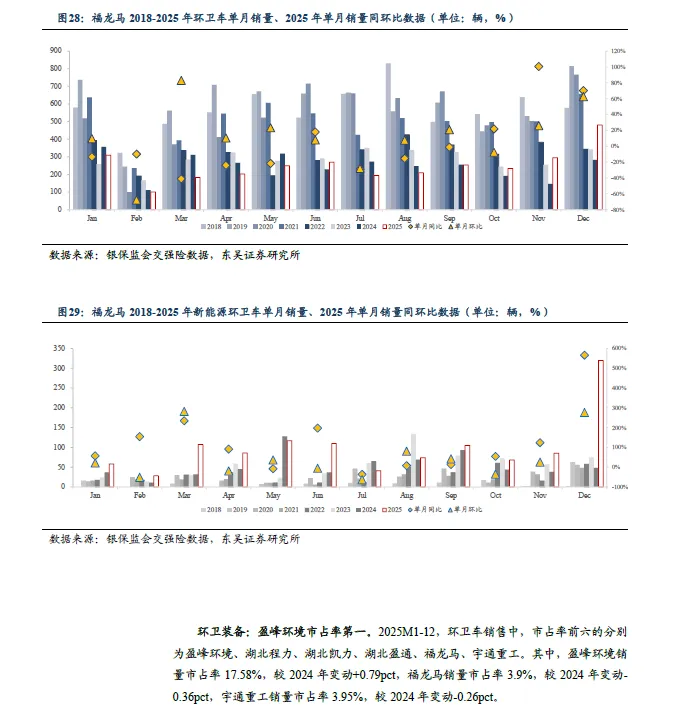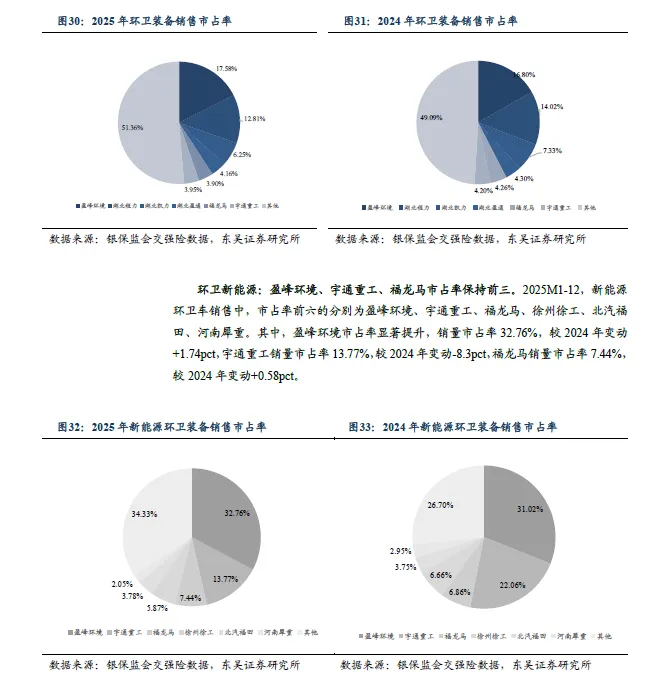 2025M1-12 环卫新能源集中度同比下滑。其中,环卫车CR3/CR6 分别为36.64%/48.64% , 同比-1.51pct/-2.77pct 。新能源CR3/CR6 分别为53.97%/65.67%,同比-5.98pct/-7.64pct。其中:1)盈峰环境:新能源销量同增80.49%,市占率第一。2025M1-12,环卫车销售13424 辆,同比+13.91%。新能源环卫车销售5281 辆,同比+80.49%。新能源市占率32.76%,较24年+1.74pct,行业第一。2)宇通重工:新能源销量同增6.63%,市占率第二。2025M1-12,环卫车销售3015 辆,同比+2.2%。新能源环卫车销售2219辆,同比+6.63%。新能源市占率13.77%,较24 年-8.3pct,行业第二。3)福龙马:新能源环卫车销量同增85%,市占率第三。2025M1-12,环卫车销售2977 辆,同比-0.37%。新能源环卫车销售1199 辆,同比+85.32%。新能源市占率7.44%,较24 年+0.58pct,行业第三。