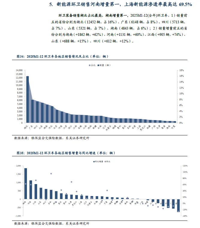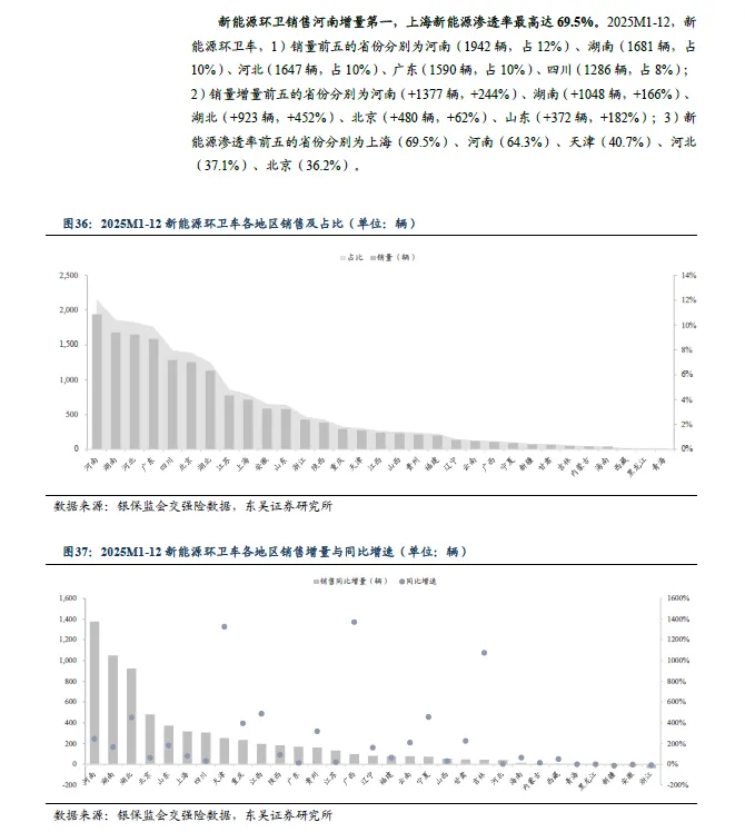 新能源环卫销售河南增量第一,上海新能源渗透率最高达69.5%。2025M1-12,新能源环卫车,1)销量前五的省份为河南(1942 辆,占12%)、湖南(1681 辆,占10%)、河北(1647 辆,占10%)、广东(1590 辆,占10%)、四川(1286 辆,占8%);2)销量增量前五的省份为河南(+1377 辆,+244%)、湖南(+1048 辆,+166%)、湖北(+923 辆,+452%)、北京(+480 辆,+62%)、山东(+372 辆,+182%);3)新能源渗透率前五的省份为上海(69.5%)、河南(64.3%)、天津(40.7%)、河北(37.1%)、北京(36.2%)。