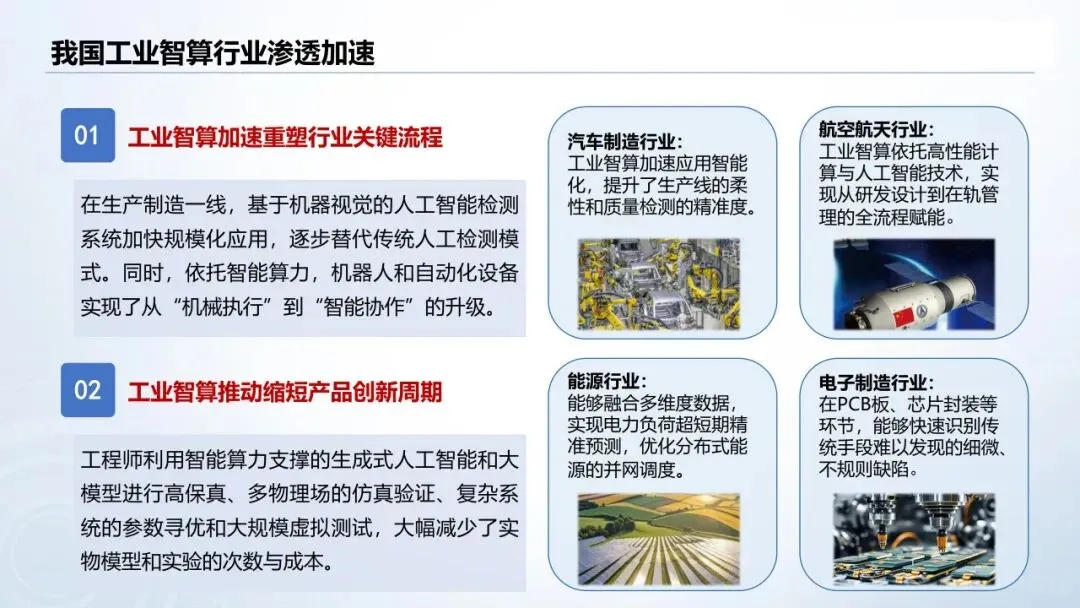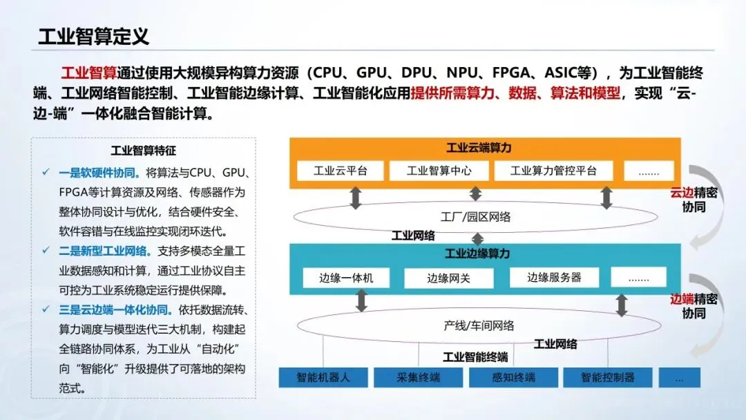 通过使用大规模异构算力资源(CPU、GPU、DPU、NPU、FPGA、ASIC等),为工业智能终 端、工业网络智能控制、工业智能边缘计算、工业智能化应用