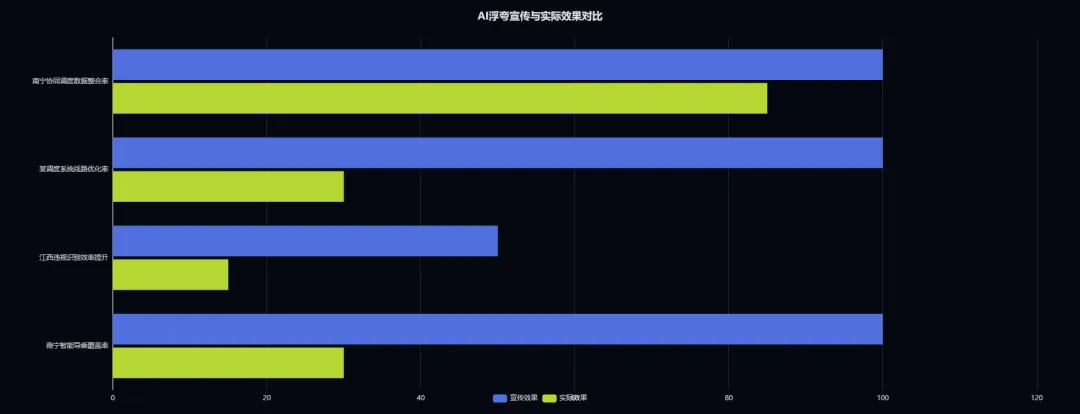 • 某公交AI调度系统将“30%重点线路优化”宣传为“100%精准调度”,实际仅覆盖早晚高峰的核心线路; • 某企业将“基础客流预测算法”称为“AI大模型”,混淆了“大模型(需海量多源数据训练)”与“传统自动化系统”的边界。
