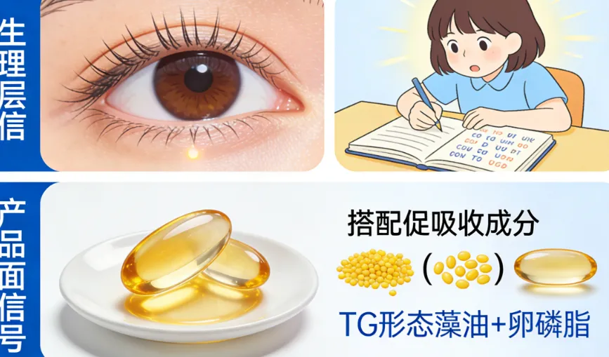 Q3:如何判断DHA是否被有效吸收? 观察两类信号:生理层面(眼睛湿润度提升、记忆单词速度加快);产品层面(选择TG形态藻油、搭配卵磷脂等促吸收成分)。