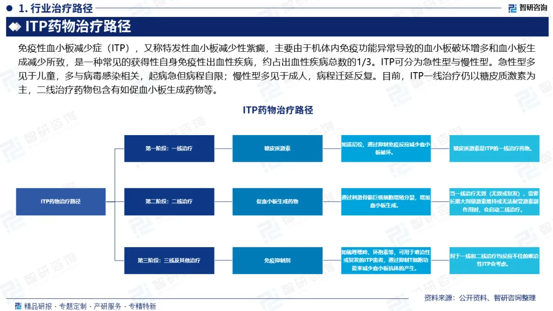 行业治疗路径:免疫性血小板减少症(ITP),又称特发性血小板减少性紫癜,主要由于机体内免疫功能异常导致的血小板破坏增多和血小板生成减少所致,是一种常见的获得性自身免疫性出血性疾病,约占出血性疾病总数的1/3。目前,ITP一线治疗仍以糖皮质激素为主,二线治疗药物包含有如促血小板生成药物等。
