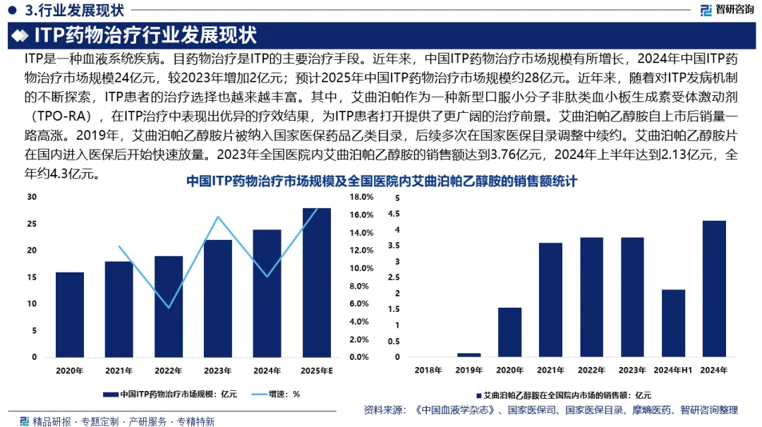 ITP是一种血液系统疾病。目药物治疗是ITP的主要治疗手段。近年来,中国ITP药物治疗市场规模有所增长,2024年中国ITP药物治疗市场规模24亿元,较2023年增加2亿元;预计2025年中国ITP药物治疗市场规模约28亿元。近年来,随着对ITP发病机制的不断探索,ITP患者的治疗选择也越来越丰富。其中,艾曲泊帕作为一种新型口服小分子非肽类血小板生成素受体激动剂(TPO-RA),在ITP治疗中表现出优异的疗效结果,为ITP患者打开提供了更广阔的治疗前景。艾曲泊帕乙醇胺自上市后销量一路高涨。2019年,艾曲泊帕乙醇胺片被纳入国家医保药品乙类目录,后续多次在国家医保目录调整中续约。艾曲泊帕乙醇胺片在国内进入医保后开始快速放量。2023年全国医院内艾曲泊帕乙醇胺的销售额达到3.76亿元,2024年上半年达到2.13亿元,全年约4.3亿元。