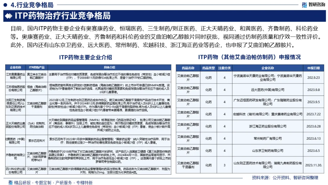 竞争情况:目前,国内ITP药物主要企业有奥赛康药业、恒瑞医药、三生制药/则正医药、正大天晴药业、和黄医药、齐鲁制药、科伦药业等。奥康赛药业、正大天晴药业、齐鲁制药和科伦药业的艾曲泊帕乙醇胺片同时获批,视同通过仿制药质量和疗效一致性评价。此外,国内还有山东京卫药业、远大医药、常州制药、宏越科技、浙江海正药业等药企,也申报了艾曲泊帕乙醇胺片。