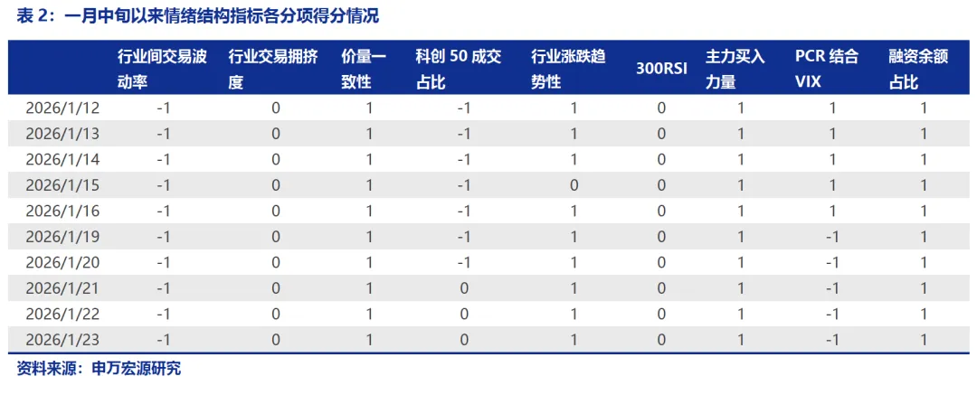 截至1月23 日,市场情绪指标数值为2.35,较上周五的2.25 小幅上升,情绪指标周内小幅震荡,从情绪角度来看,模型观点偏中性。从具体分项指标变化来看,多数指标维持在偏高位置,情绪支撑较强。