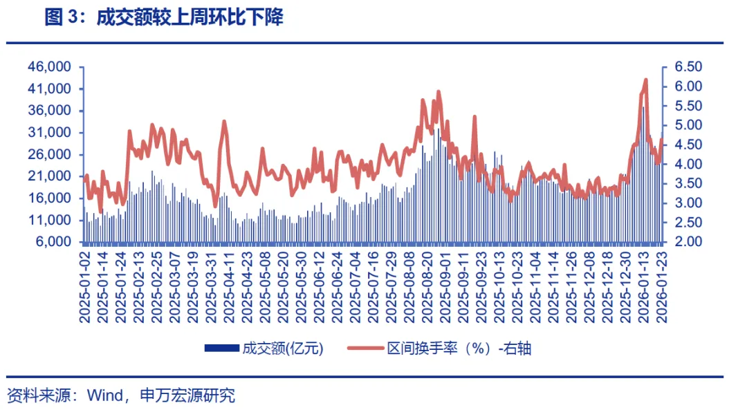 成交额方面,本周全A 成交额较上周环比下降19.22%,平均日成交额为27989.42 亿元,表明市场成交活跃度与上周相比有所降温。其中1 月23 日成交额为周内最高31181.08亿元人民币,日成交量1777.17亿股。