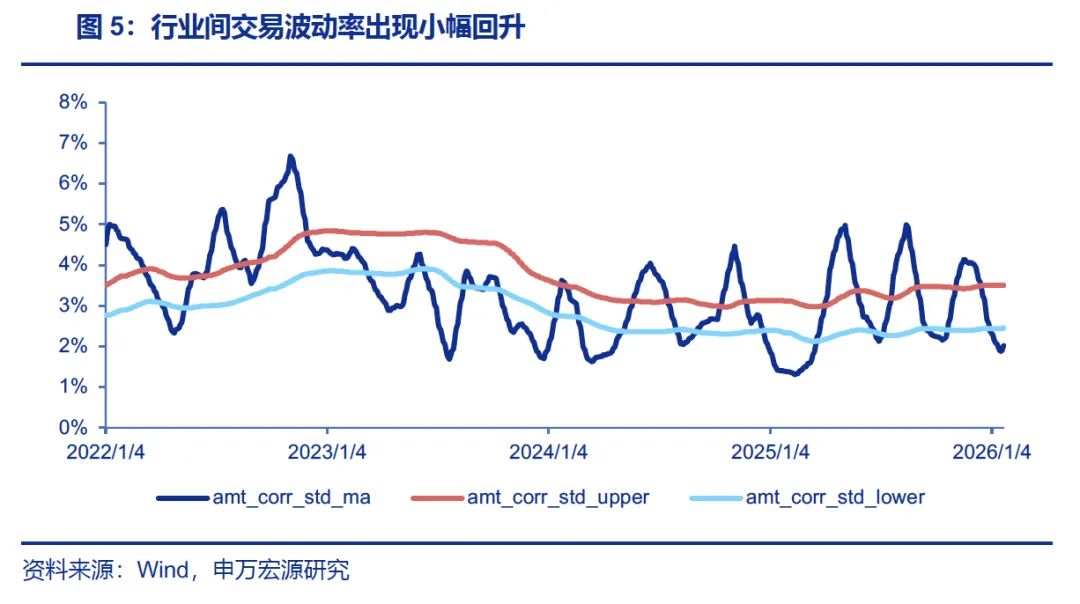 行业间交易波动率出现小幅回升,表明当前资金切换活跃度上升,资金在不同行业间切换频率出现回升,交易活跃度出现回暖。