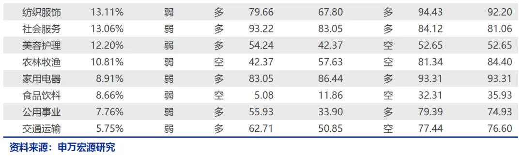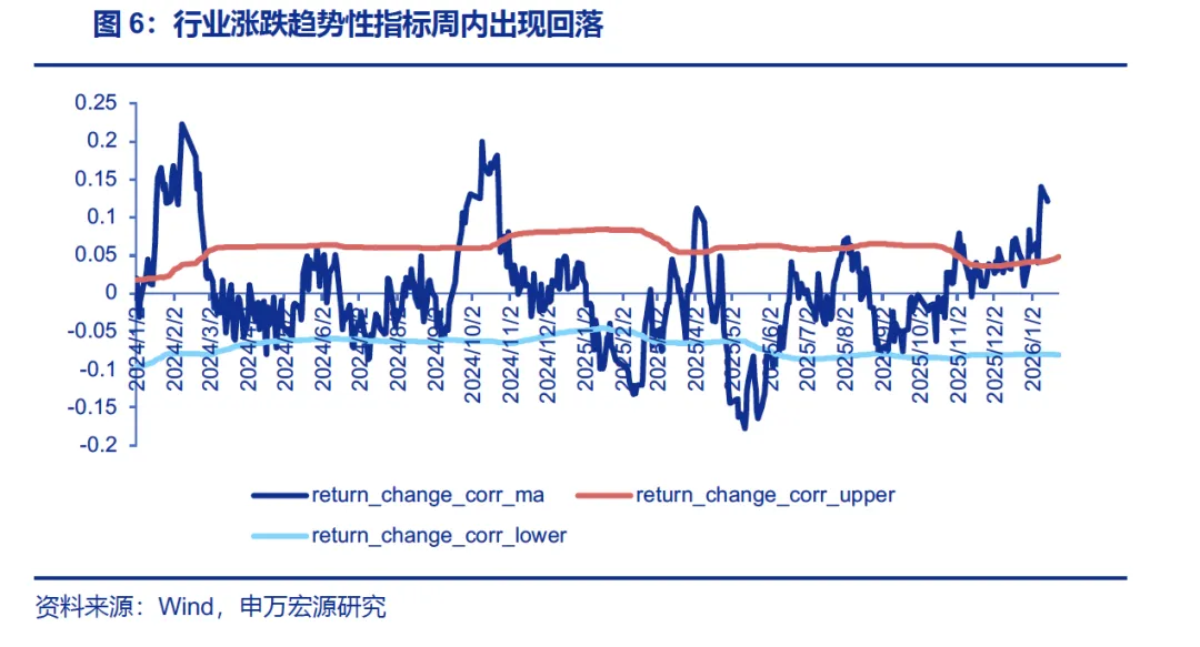 行业涨跌趋势性指标周内出现回落,但当前仍处于布林带上方,表明当前资金行业观点一致性仍处于较高水准,市场对行业短期价值判断一致性较高,行业指数趋势的持续维持高位代表当前市场板块β效应较强。
