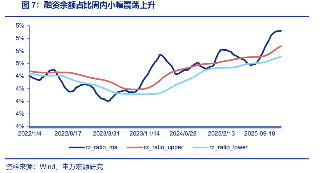 融资余额占比周内小幅震荡上升,指标当前仍处于布林带上界之上,表明当前市场杠杆资金情绪维持较高水平。市场上投资者风险偏好水平维持在较高水平,且资金运用趋于活跃,融资市场交易维持高活跃度。