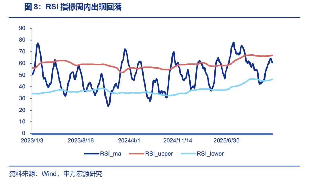 情绪指标维持平稳,科创50 成交额占比、行业间交易波动率出现回升:本周价量一致性指标周内维持高位震荡,市场价量匹配程度仍处于较高水平,资金关注度与标的涨幅之间保持较强相关性,短期内价格变动与市场关注度一致性维持高位,反映市场情绪仍处于相对活跃区间;科创50相对万得全A成交占比周内回升,表明市场风险偏好出现边际改善迹象,高弹性板块交易关注度有所提升;行业间交易波动率小幅回升,资金在不同行业间切换频率有所提高,跨行业轮动活跃度边际改善,市场交易活跃度出现一定回暖;行业涨跌趋势性指标周内出现回落但仍运行于布林带上方,反映市场对行业短期价值判断一致性仍处于较高水平,板块β 效应依然占据主导;融资余额占比周内小幅震荡上行并持续运行于布林带上界之上,显示杠杆资金情绪维持在偏高水平,市场风险偏好整体仍处于相对积极区间;RSI 指标周内出现回落,短期上行动能有所减弱,卖盘力量边际增强,市场参与意愿阶段性下降,后续仍需进一步观察;主力资金净流入指标维持高位震荡,主力买入力度较强,机构资金配置意愿提升,市场整体做多动能得到一定支撑。