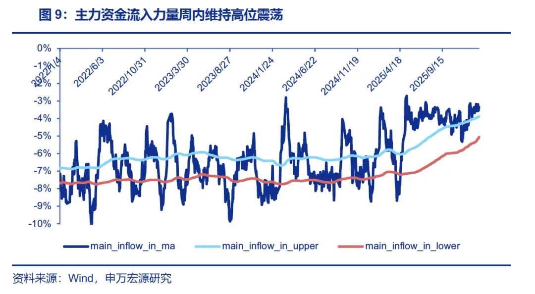 本周主力资金净流入指标维持高位震荡,反映当前主力买入力量较强,主力资金进场意愿提升。反映出机构资金对市场的主动配置积极性有所提升,整体操作偏向积极,市场做多动能得到进一步夯实。