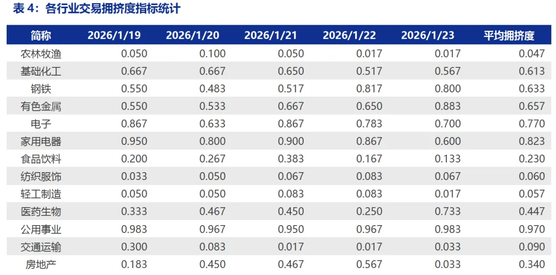 截至2026 年1 月23 日,本阶段平均拥挤度最高的行业分别为公用事业、计算机、传媒、银行、石油石化,拥挤度最低的行业分别为环保、纺织服饰、综合、轻工制造、农林牧渔。