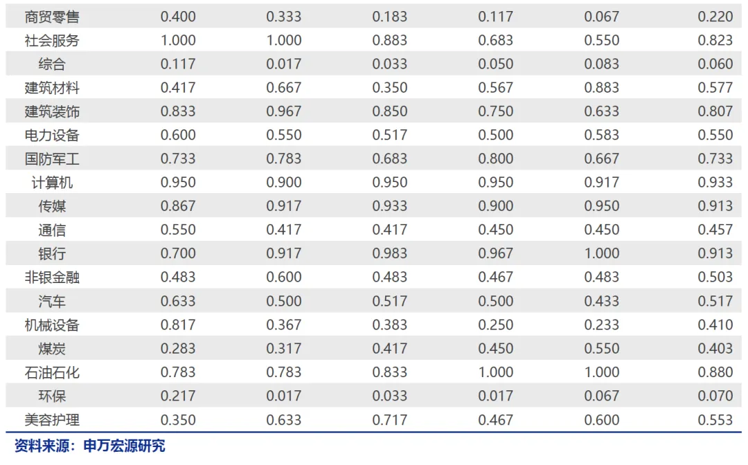 本次测算根据申万一级行业分类对行业指数的成交额与换手率按照过去20日均值与波动率进行标准化,得到行业的交易热度指标。行业成交额与换手率与行业目前受到市场的关注度呈正相关,成交额与换手率高的行业拥挤度越高。因此行业热度指标一定程度上反映了申万一级行业指数在过去20日交易热度水平。考虑到不同行业体量不同,因此行业热度指标之间存在天然差异,为了进一步消除行业差异我们将拥挤度最终定义为行业热度指标滚动60日的百分比排名。