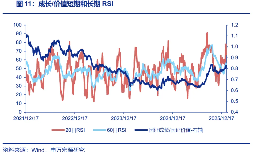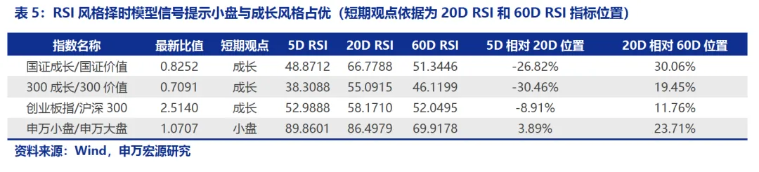 RSI 的值在0-100 之间变动,超过50 则表明市场上买方力量强势,其数值越大则表明买方力量越强。我们将RSI 的计算方法运用到相对风格的指数之上,通过计算两个风格指数自某一固定基日起的净值相除,得到净值比值序列,计算该序列的RSI 指标。我们可以设置不同长度的RSI 计算窗口,这里我们分别计算了5 日、20日、60日RSI,并根据20日和 60日RSI的相对位置判断风格观点。当20日RSI>60日RSI,则比值的分子端风格占优,否则分母端风格占优。根据下表结果,当前模型维持提示小盘风格占优信号,且5日RSI相对20日RSI有所下降,未来信号存在削弱可能。同时模型切换提示成长风格占优信号,信号提示强度较强,但5 日RSI 相对20日RSI出现快速下滑趋势,短期信号可能出现越弱,指标有待未来进一步观察。