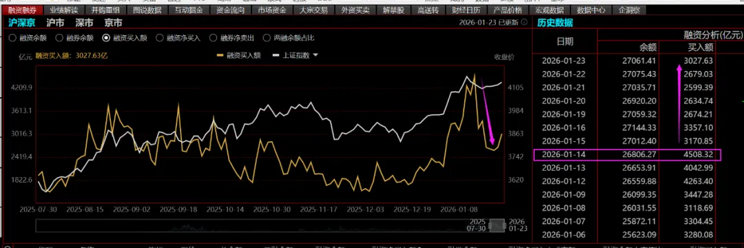 这是融资相关数据,黄色的是融资买入额,可以看到融资买入额自2025年12月初不断增加,元旦之后开始加速,最终在1月14日达到最高峰4508亿元,也就是在这天,限制两融的政策在中午出台,随后融资买入额开始下降,这就是政策对盘面的影响,政策本身不会买卖,但外因可以通过内因起到作用,也就是政策本身通过干预了融资,也就是干预了资金这个关键事物,使得最近的盘面停下了原有的快速上涨的脚步,转而进入了震荡整理的阶段。