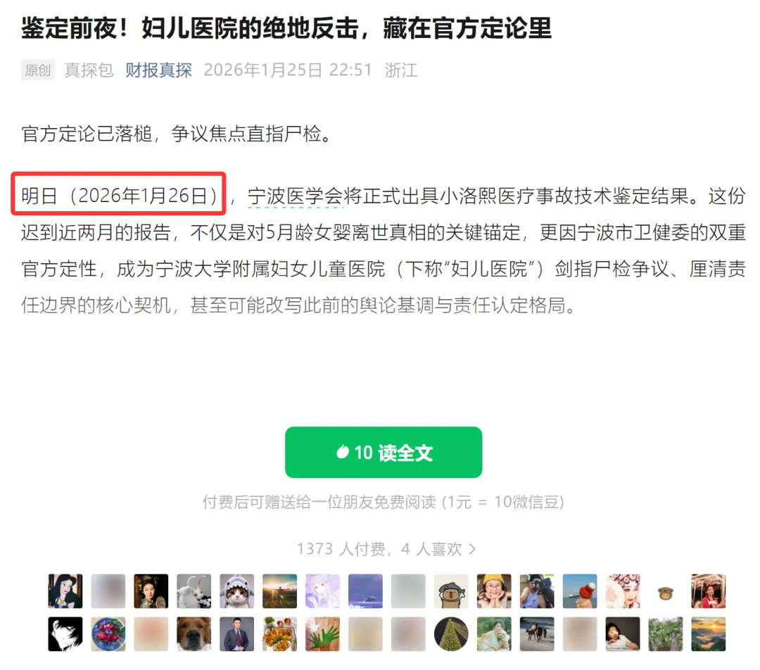 可它在1月25日的付费文章中,清清楚楚地写明了“明日(2026年1月26日),宁波医学会将正式出具小洛熙医疗事故技术鉴定结果”。