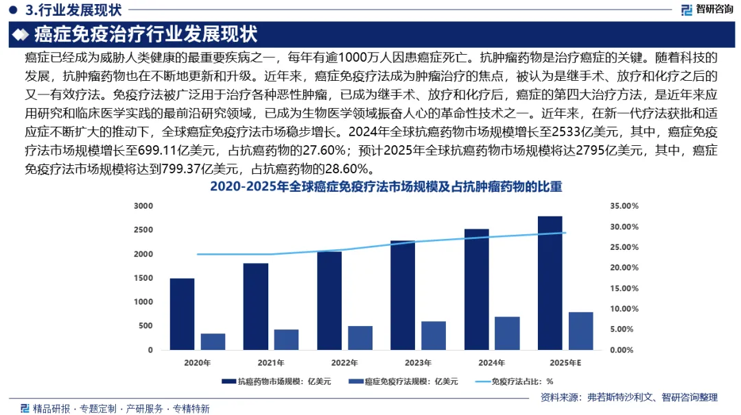 市场规模:近年来,在新一代疗法获批和适应症不断扩大的推动下,全球癌症免疫疗法市场稳步增长。2024年全球抗癌药物市场规模增长至2533亿美元,其中,癌症免疫疗法市场规模增长至699.11亿美元,占抗癌药物的27.60%;预计2025年全球抗癌药物市场规模将达2795亿美元,其中,癌症免疫疗法市场规模将达到799.37亿美元,占抗癌药物的28.60%。
