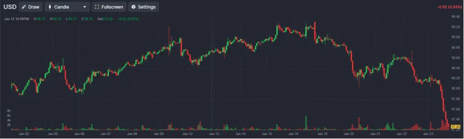 而宏观层面上,一个历史上给市场提供“宏观经济”规划和某种确定性的达沃斯“经济论坛”,在2026年却成为一个“政治论坛”。在华盛顿市的眼下,给市场带来的反而是冲击。特别是在川普各种“宏观经济”无关话题爆论后,美元指数一路下跌。截至周五,美元指数创2026年新低97.26,远远低于一年前川普入驻白宫时的110+的水平。