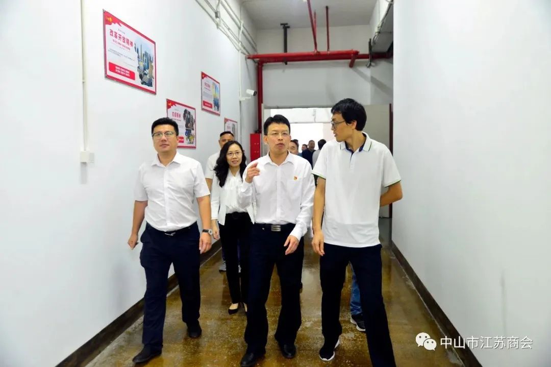 在中山市悦辰电子实业有限公司董事长余清的带领下参观了企业的展厅、自助餐厅、微心愿墙、“我为群众办实事” 、服务指引、健身房、研发实验室、生产车间等。