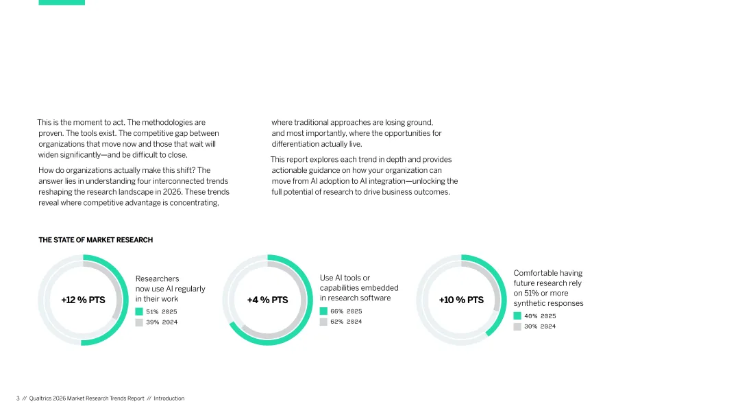 在 AI 技术全面渗透的当下,全球市场研究领域正经历结构性变革。95% 的研究者已常态化使用或尝试 AI 工具,单纯的技术采纳不再是竞争优势,人机智能在全研究周期的协同编排成为区分领先者与追随者的关键。报告聚焦四大核心趋势,揭示了市场研究从工具应用到能力重塑的转型路径,为企业解锁研究价值提供了行动指南。