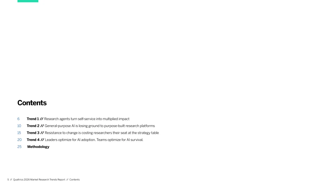 趋势二:专用研究平台取代通用 AI 工具。AI 采纳已进入平台化整合阶段,通用 AI 工具使用率从 2025 年的 75% 降至 67%,而嵌入式专用研究平台使用率从 62% 升至 66%。采用合成数据的研究者中,45% 将其视为最可靠的数据来源,超越传统在线样本组。领先团队正从零散工具应用转向整合式系统,通过对话式分析、视觉内容分析等进阶功能,拓展研究边界,实现从效率提升到能力升级的跨越。