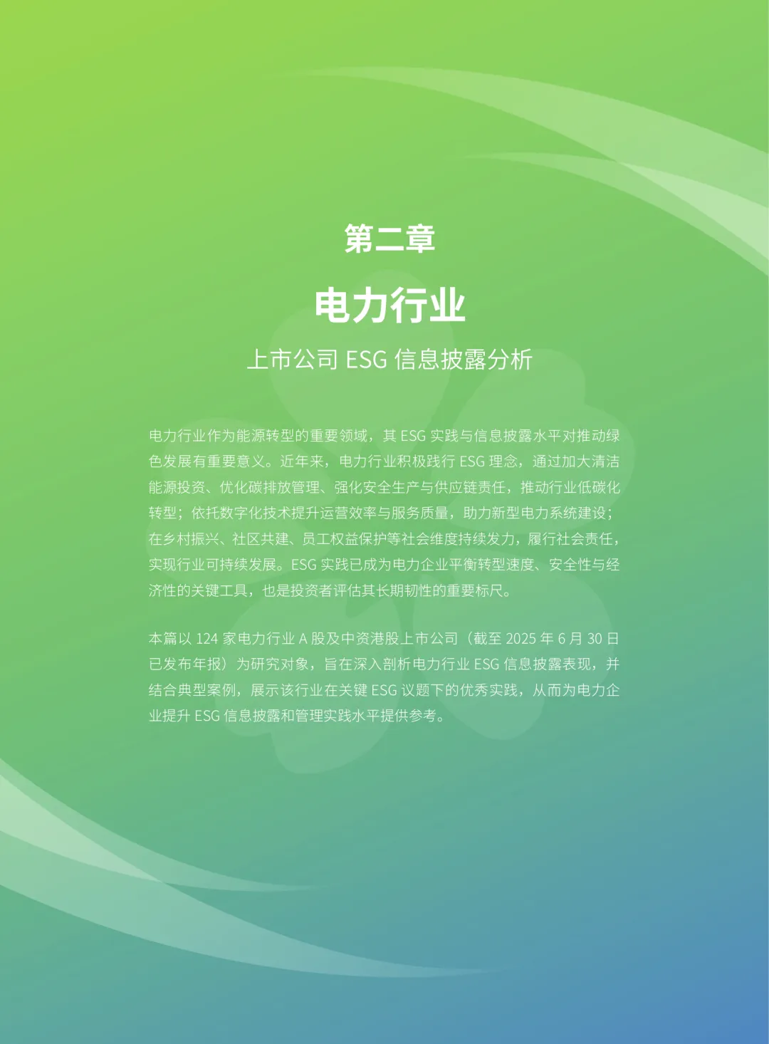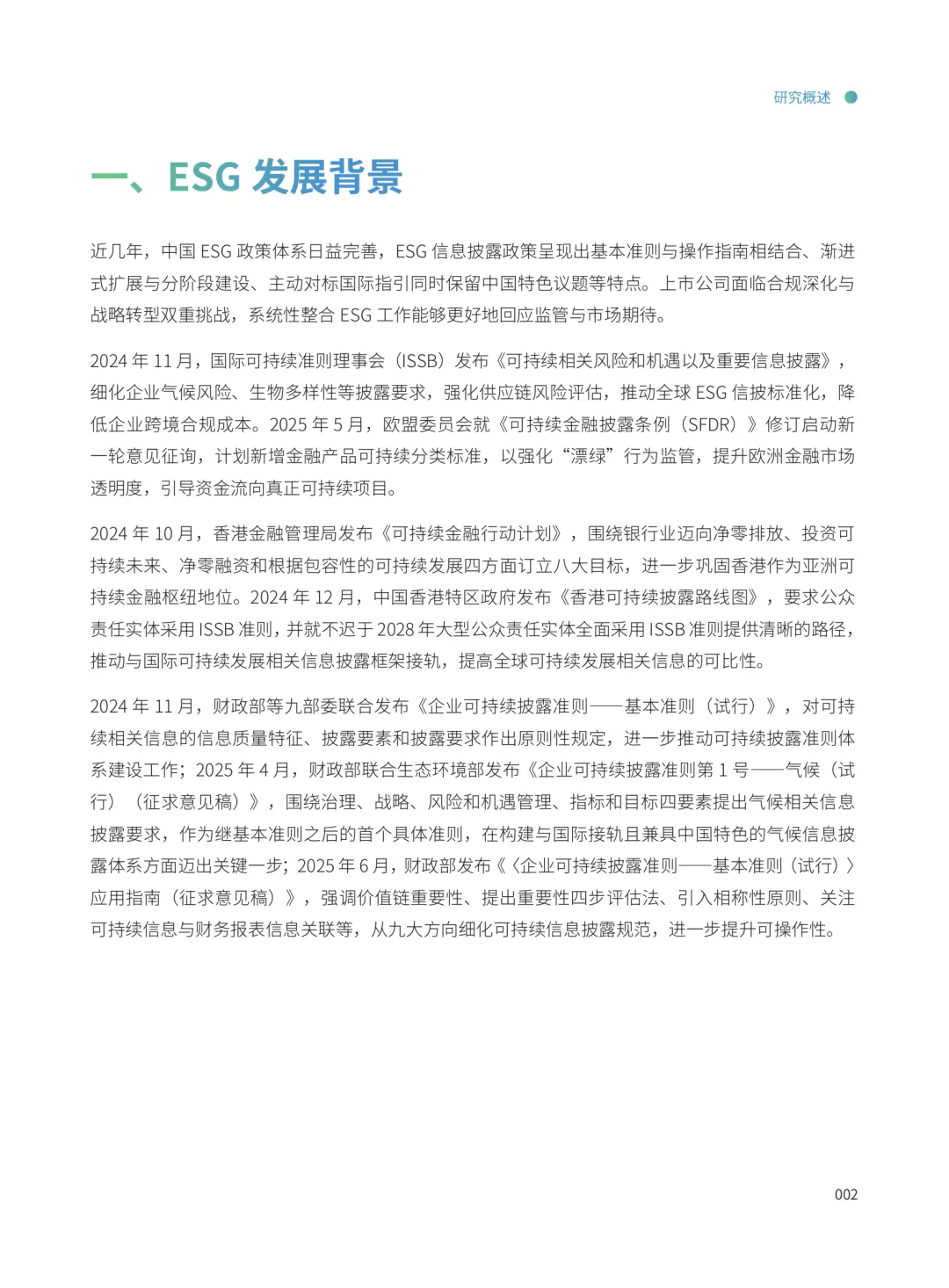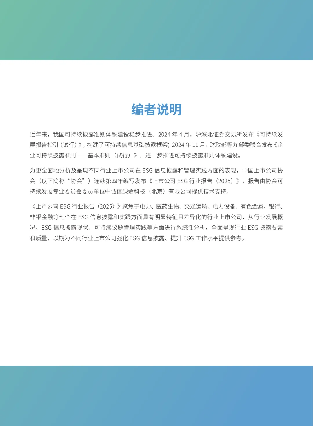 本报告聚焦中国上市公司在ESG(环境、社会和治理)领域的信息披露与管理实践,选取电力、医药生物、交通运输、电力设备、有色金属、银行、非银金融等七个具有显著特征的行业,进行系统分析。报告旨在全面展示各行业在ESG方面的披露情况及管理成效,为相关企业提升ESG工作水平提供参考。我国在可持续披露准则体系建设方面取得积极进展。2024年4月,沪深北证券交易所发布《可持续发展报告指引(试行)》,初步构建了可持续信息的基础披露框架。同年11月,财政部等九部委联合发布《企业可持续披露准则——基本准则(试行)》,进一步推动该体系的完善。