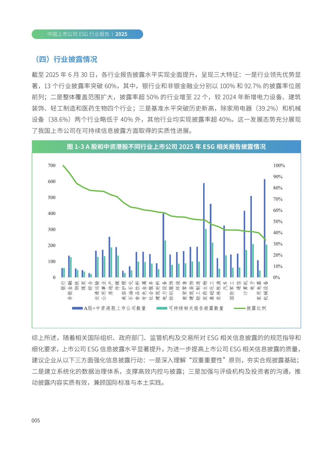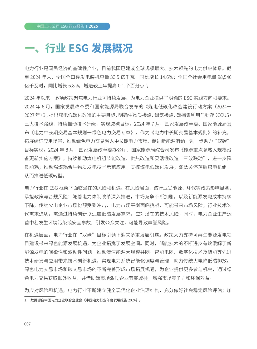 本报告聚焦中国上市公司在ESG(环境、社会和治理)领域的信息披露与管理实践,选取电力、医药生物、交通运输、电力设备、有色金属、银行、非银金融等七个具有显著特征的行业,进行系统分析。报告旨在全面展示各行业在ESG方面的披露情况及管理成效,为相关企业提升ESG工作水平提供参考。我国在可持续披露准则体系建设方面取得积极进展。2024年4月,沪深北证券交易所发布《可持续发展报告指引(试行)》,初步构建了可持续信息的基础披露框架。同年11月,财政部等九部委联合发布《企业可持续披露准则——基本准则(试行)》,进一步推动该体系的完善。